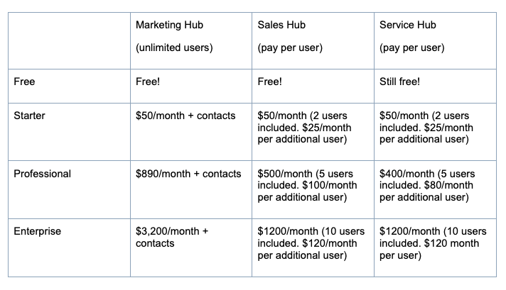 Each hub has four distinct tiers, from most basic to most sophisticated: Free, Starter, Professional, and Enterprise. As you move up tiers, you get more and more functionality and tools, and fewer limits on the tools you have.
